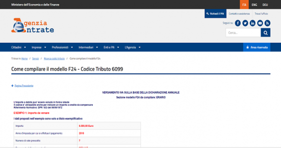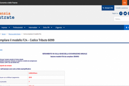 Infine nel modello F24 si dovrà segnalare l’anno di imposta (sotto ‘anno di riferimento’) e l’importo, prestando attenzione alla colonna a seconda se si abbia a che fare con crediti o debiti Iva annuale da versare con il codice tributo 6099.