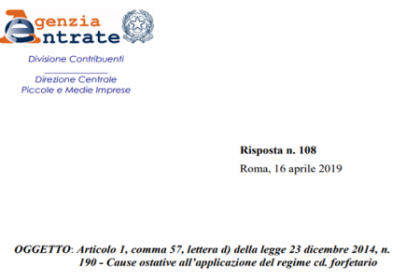 Regime forfettario con esclusione per il commercialista che detiene quote di controllo in una SRL che si occupa di revisione e certificazione di bilanci. I chiarimenti nella risposta all’interpello n. 108 del 16 aprile 2019.